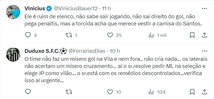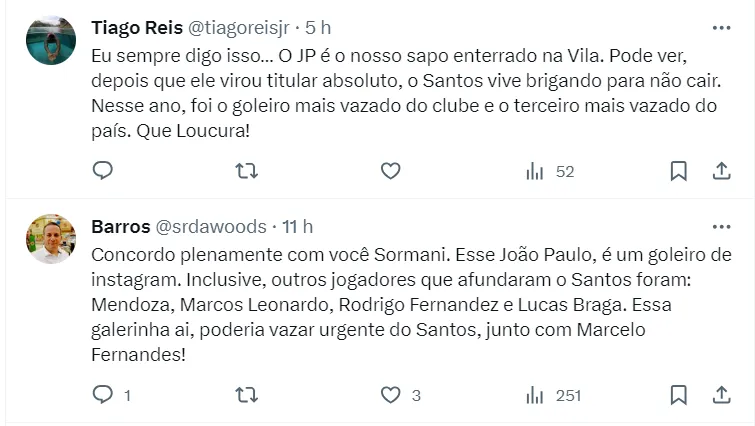Nos comentários da publicação, os torcedores divergiram da opinião. Há quem acredite que João Paulo não merece vestir a camisa do Santos, enquanto alguns destacam que o problema do Peixe vai muito além. A expectativa é que o novo presidente consiga arrumar a casinha e colocar a equipe em condições de buscar por títulos em 2024.