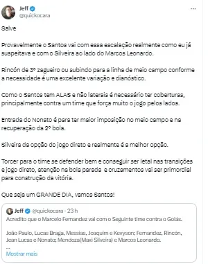 Em relação a Série A do Campeonato Brasileiro, o Santos está com 38 pontos e em 14° lugar na tabela da competição. O Alvinegro Praiano volta a campo contra o Goiás, na noite da próxima quinta-feira (9), às 19h, fora de casa.