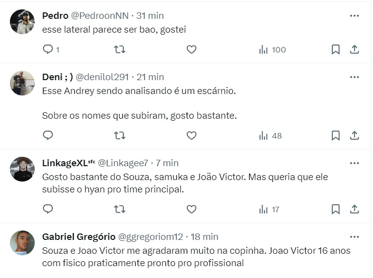 “O Andrey está sendo observado. É um pedido do Carille. Ele não consta na nossa programação de jogadores, seja no Grupo 1 ou Grupo 2, pois está sendo avaliado. Dentro da nossa política, queremos dar oportunidades para os jovens talentos que estão subindo da base”.