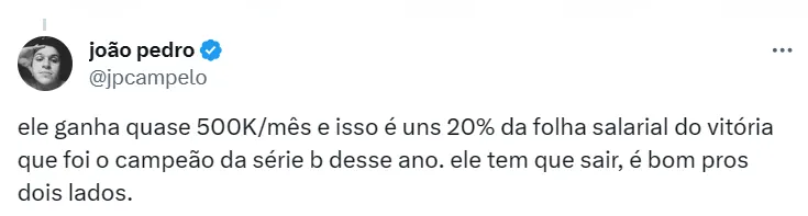 “Se o clube precisar fazer caixa – e vai precisar, é uma coisa óbvia – o João Paulo não negaria sair do clube. Porém, virar as costas para a entidade no momento que ela mais precisa, por valor financeiro, ninguém mais que o João Paulo já provou que ele tem esse tipo de caráter, que dinheiro para ele não é tudo na vida”, comentou o agente.