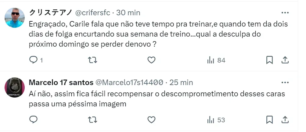 O elenco do Santos recebeu uma folga dupla e se reapresentará somente na quarta-feira (21). Muitos torcedores lembram a queda de rendimento do time, que, nos últimos três jogos, somou apenas quatro pontos.
