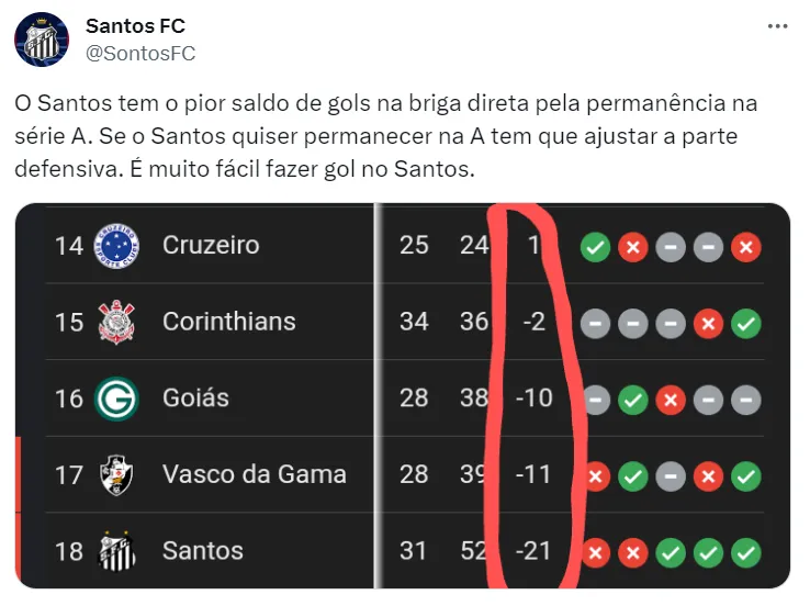 Hoje, com um saldo negativo de 21 gols, o Santos fica atrás de todos os seus concorrentes à queda, especialmente aqueles que estão mais próximos do Z-4 (Corinthians, com saldo -2, Goiás, com saldo -10, e Vasco, com saldo -11). Agora, o Peixe precisa voltar a vencer e conquistar pontos, para somente assim conseguir se livrar da segunda divisão.