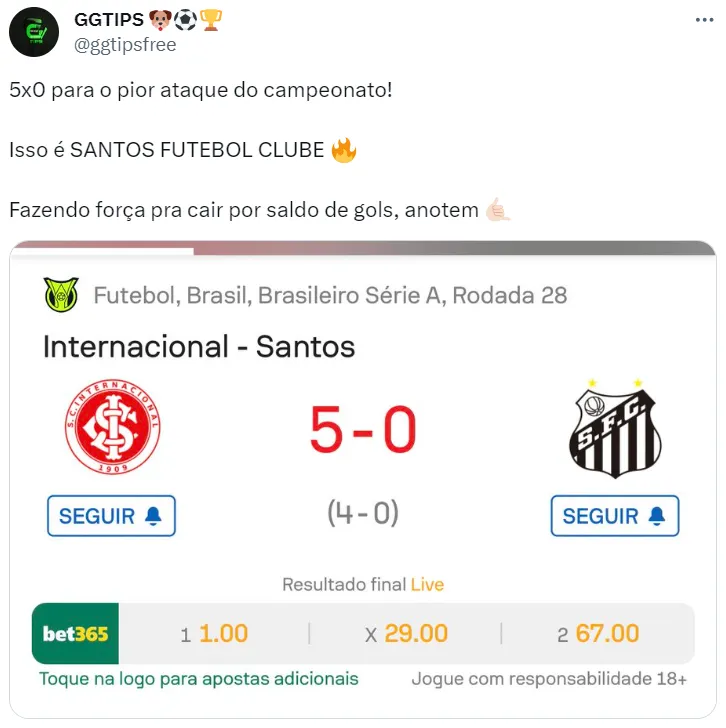 A situação do Santos, que já não era nada simples, se complicou ainda mais após a goleada de 7 a 1, sofrida para o Internacional. Na reta final do Campeonato Brasileiro, o resultado tão negativo agravou ainda mais a situação do Peixe. Atualmente, o Alvinegro Praiano é o segundo time mais vazado do segundo turno da competição.