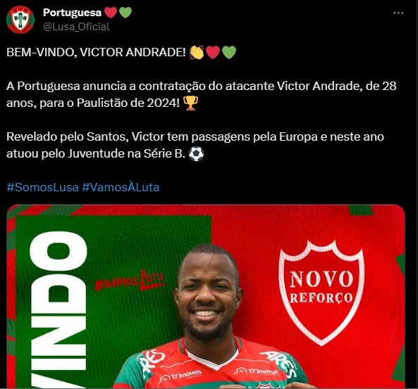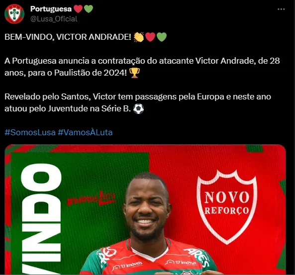 Depois de passar por diversos clubes, Victor Andrade acabou acertando com a Portuguesa para a disputa do Campeonato Paulista de 2024. A Lusa, inclusive, está no grupo do Santos no estadual.