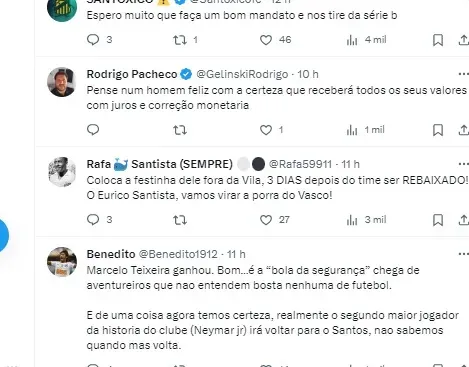 Diante disso, terminada as eleições, queremos que o Santos seja único, que todos estejam unidos para que estejamos trabalhando, a partir de janeiro de 2024, para que tenhamos a chance e oportunidade de recolocar o Santos no seu devido patamar”, finalizou o mandatário.