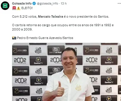 Com 53% dos votos válidos, ele assume o lugar que será deixado por Rueda e comandará o Clube em seu primeiro ano de Série B. Diante disso, a primeira mudança imposta pelo novo presidente é não usar a camisa 10 na temporada que vem, já que ela era de Pelé. Inclusive, o atual dono da vestimenta pode sair.