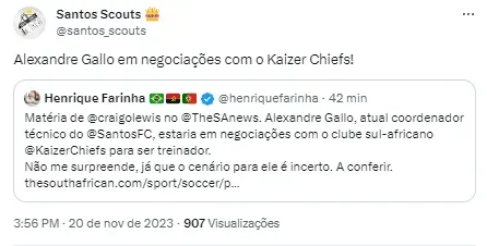 Até o momento, Gallo estaria conversando com o Kaizer Chiefs, com a liderança do gestor Cavin Johnson, quem teria optado pelo alvinegro. Na África do Sul, o dirigente do Santos foi tratado como um “importante técnico brasileiro”.