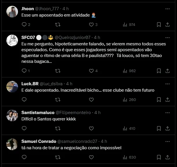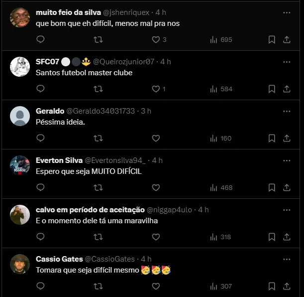 A torcida também ‘comemora’ a dificuldade dessa contratação ser concretizada: “que bom que é difícil, menos mal para nós“. A reação dos santistas são basicamente a mesma, ninguém gostou da ideia.