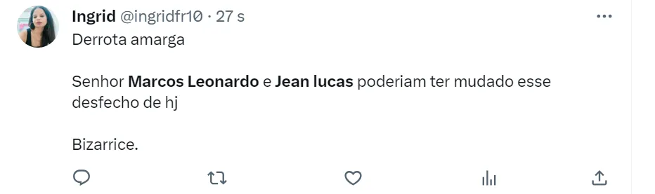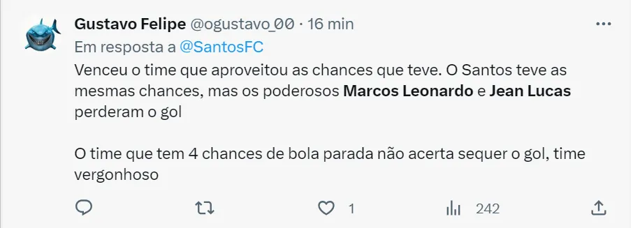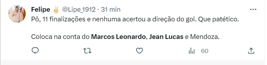 “Ponto positivo foi o Lucas Lima (sim), apareceu pra jogo bastante e com ótimos passes”, disse um torcedor no Twitter. “Injustificável ter tirado o Lucas Lima. Querendo ou não, era o único que armava nesse time e gerou duas boas oportunidades de gols que foram desperdiçadas. Essa mentalidade de derrotado vai rebaixar o Santos”, afirmou outro santista na rede social,