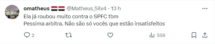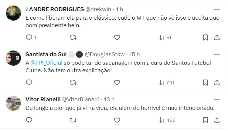 Além da nota oficial enviada pelo Santos, os torcedores utilizaram as redes sociais para se manifestar contra a escolha da arbitragem. A torcida acredita que a árbitra pode acabar prejudicando a equipe, mais uma vez.
