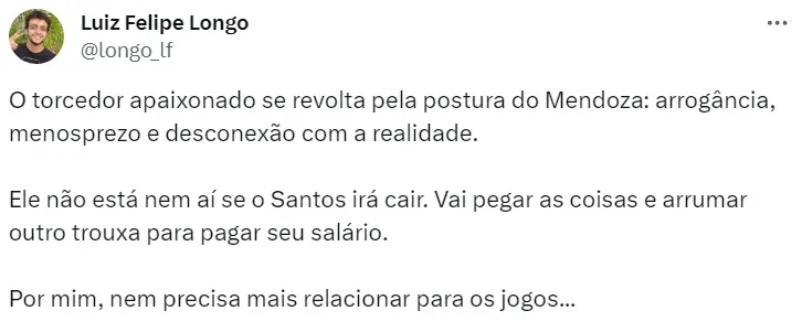 Uma das primeiras contratações para a temporada de 2023 do Peixe, Mendoza fechou contrato com o Santos em dezembro do ano passado, para um vínculo de três anos com o clube.