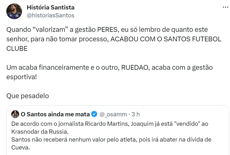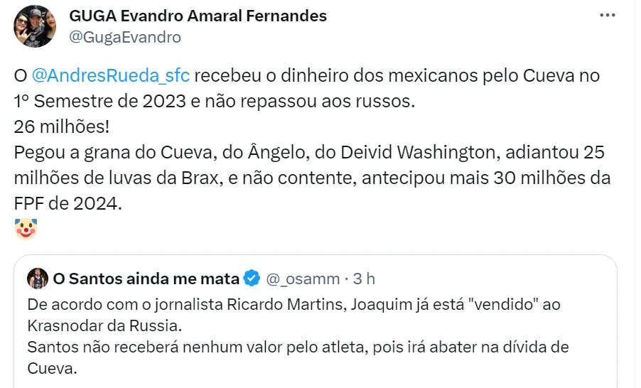 “Joaquim está vendido. Vai para o Krasnodar e o Santos não vai ver um um real da transferência. Vai abater a dívida de Cueva. O Santos está na FIFA brigando, mas tem que pagar o Krasnodar”, disse o jornalista.