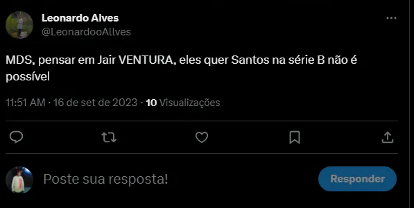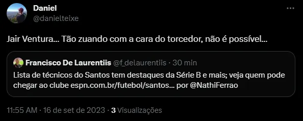 O primeiro, que já treinou o Santos em 2018, está em grande fase no Atlético-GO, com sete jogos no comando do Dragão, sendo cinco vitórias e dois empates. Vale destacar que no Peixe, Ventura teve 37 jogos, com 14 vitórias, nove empates e 14 derrotas, não conseguindo render um ataque com Gabigol, Bruno Henrique e Rodrygo. A torcida não gostou muito do nome do ex-treinador como cotado: “Jair Ventura… Tão zuando com a cara do torcedor, não é possível…“, “É sério que a diretoria está pensando em Jair ventura ? De novo?” e “MDS, pensar em Jair VENTURA, eles quer Santos na série B não é possível”, foram alguns dos comentários.