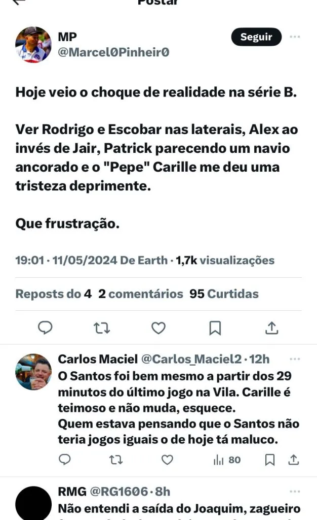 Apesar da defesa do treinador, o meio-campista foi alvo de críticas da torcida santista, que até então não aprovou a postura do jogador em campo: (SIC) “Hoje veio o choque de realidade na série B. Ver Rodrigo e Escobar nas laterais, Alex ao invés de Jair, Patrick parecendo um navio ancorado e o “Pepe” Carille me deu uma tristeza deprimente. Que frustração!”, disse um torcedor através das redes sociais.
