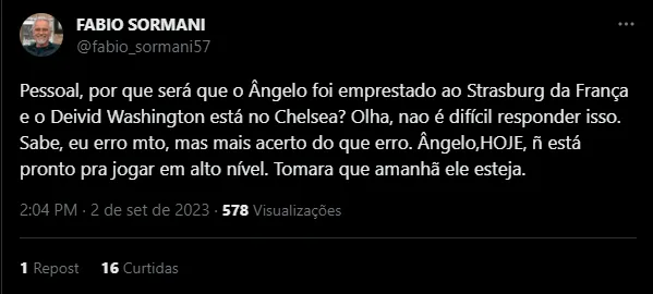 Assim, em sua conta oficial no Twitter, o jornalista Fábio Sormani tratou de dar a opinião sobre a opção do Chelsea (ING) de emprestar Ângelo e manter Deivid no elenco. Na opinião do jornalista, o ex-camisa 11 do Peixão ainda não está pronto para jogar em alto nível, diferentemente de Deivid. Posto isso, o Santos entra em campo neste domingo (3), às 18h30, contra o América-MG.