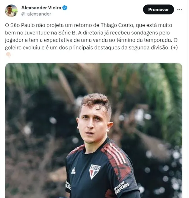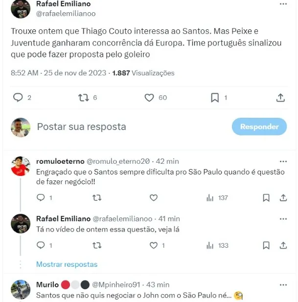 “Trouxe ontem que Thiago Couto interessa ao Santos. Mas Peixe e Juventude ganharam concorrência dá Europa. Time português sinalizou que pode fazer proposta pelo goleiro”, informou Rafael.