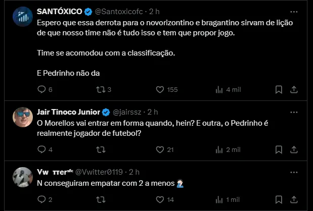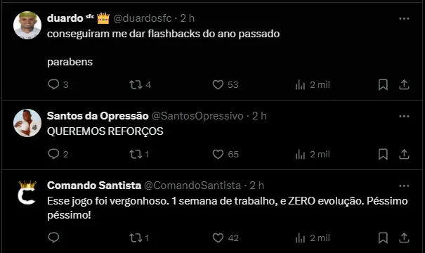 “Time muito desconcentrado, tomando decisões erradas. Tentamos mexer, mudar para que não tivéssemos um jogo tão moroso, tão lento. Melhoramos um pouquinho, mas poderia ter sido muito mais“, disse o treinador do Santos.