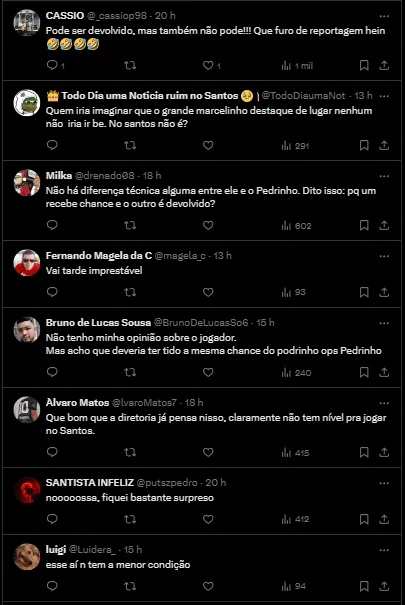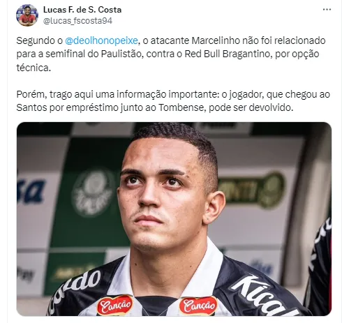 “Porém, trago aqui uma informação importante: o jogador, que chegou ao Santos por empréstimo junto ao Tombense, pode ser devolvido”, concluiu Lucas Costa.