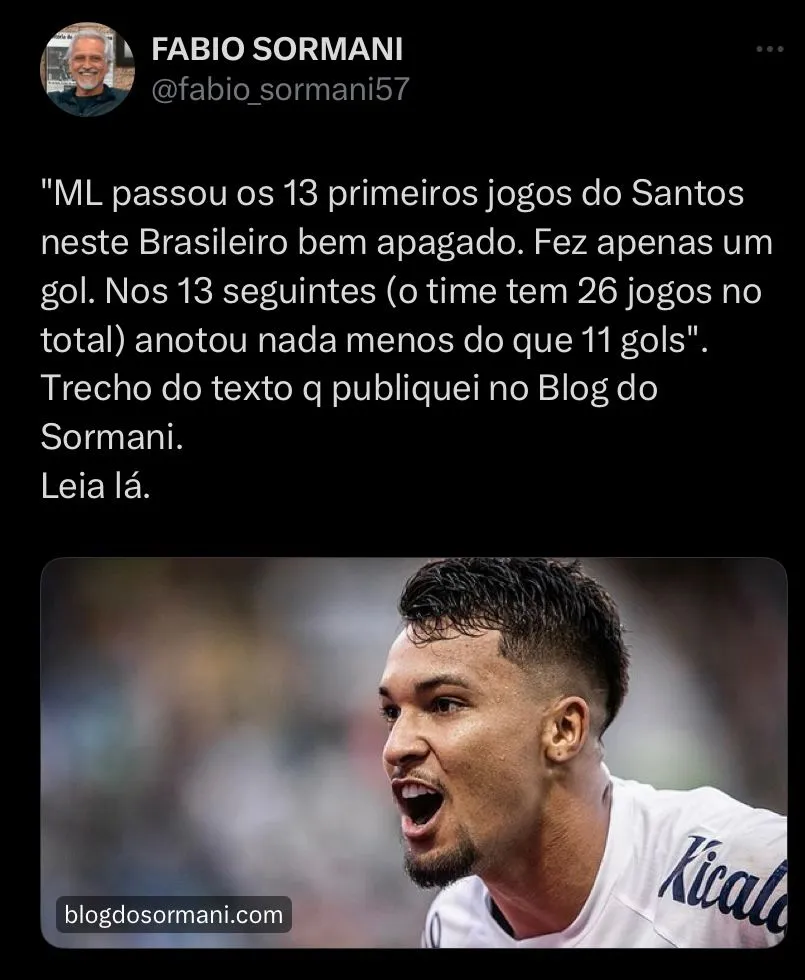Durante o podcast ‘Deu Zebra’, Fábio Sormani abriu o jogo sobre ter revelado ao público que torce para o Santos e comentou sobre o que acha sobre Marcos Leonardo. “Eu sou um cara muito crítico ao Marcos Leonardo, muito, muito, muito, eu acho ele um jogador limitado”, disse. “Mas, o que ele progrediu nesses últimos meses, é uma coisa absurda”, destacou Sormani.