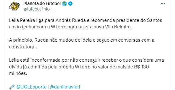Em meio a isso, uma situação nos bastidores acabou chamando a atenção. É sabido que a diretoria do Alvinegro Praiano tem uma parceria com a WTorre, que será a responsável pela construção da nova Vila Belmiro. No entanto, a presidente do Palmeiras Leila Pereira telefonou para Andrés Rueda para falar sobre a negociação do Peixe com a empresa e acabou dando um conselho inesperado para o mandatário santista.