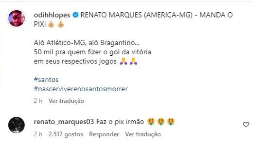 Para não ver o clube cair pela primeira vez em sua história, os santistas têm feito de tudo. Por exemplo, o humorista Dihh Lopes, integrante do grupo Os 4 Amigos e santista fanático, prometeu um Pix para o jogador do América que marcasse o gol decisivo do Coelho contra o Bahia.