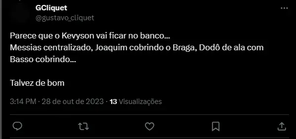 De acordo com o Diário do Peixe, o lateral-esquerdo Kevyson tem chances de sair do time e iniciar a partida no banco de reservas. O ala, que vem sendo uma válvula de escape pela esquerda, está com atuações irregulares.