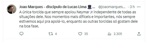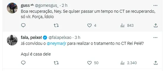De maneira oficial, o Santos se manifestou a respeito da contusão de Neymar. Através de uma de suas redes sociais, o Alvinegro Praiano desejou melhoras ao atacante formado na Vila Belmiro e disse que os torcedores estão torcendo por sua recuperação: “A nação santista está com você mais uma vez, Neymar. Força, Menino da Vila”, dizia a mensagem destinada ao camisa 10 da Seleção Brasileira.