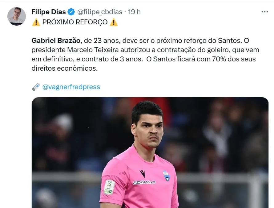 O Santos oferece um contrato de três temporadas para Gabriel Brazão e compraria 70% dos seus direitos econômicos. Ele é um pedido de Carille para fechar o elenco alvinegro.