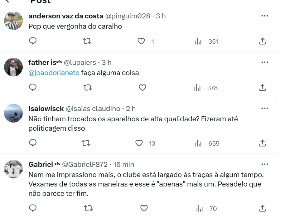 E houve muito torcedor do Peixe ‘cornetando’ as instalações do DM alvinegro, especialmente o presidente Andres Rueda. Na imagem compartilhada por Soteldo, a qual já há mais de 12 mil visualizações, nota-se a maca coberta por um colchonete rasgado. “Que vergonha, olha essa maca”, critica um torcedor no Twitter. “Nem na minha academia fundo de quintal é assim”, completa outra na bronca com o DM do Peixe.