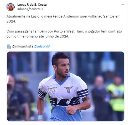 Para começo de conversa, o meia-atacante já deixou claro seu desejo de voltar ao Alvinegro Praiano. Felipe Anderson foi campeão da Libertadores no Santos e quer voltar a Vila Belmiro.