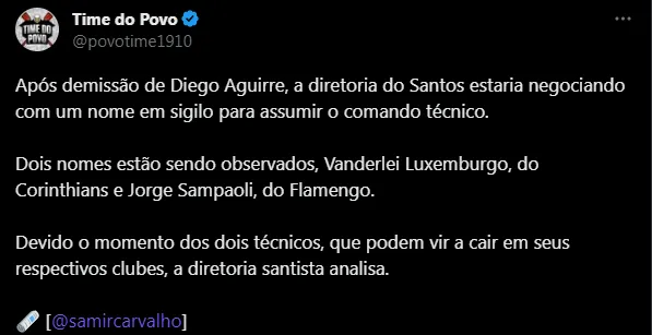 Trata-se de Vanderlei Luxemburgo, atual treinador do Corinthians e que vem sendo muito criticado pelos torcedores do Timão. De acordo com informações do jornalista Samir Carvalho, do portal UOL, a cúpula santista estaria negociando com um nome em sigilo para assumir o comando técnico. Segundo o colunista, o nome de Vanderlei Luxemburgo está entre os observados, visto que sua situação é delicada no Corinthians. Entretanto, por mais que as conversas estejam ocorrendo, é um movimento improvável de Rueda.