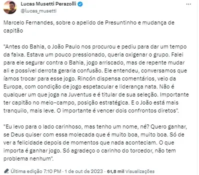 “Rincón dispensa comentários, veio da Europa, com condição de jogo espetacular e liderança nata. Não é qualquer um que joga na Juventus e é titular de sua seleção. Importante ter capitão no meio-campo, posição estratégica. E o João está mais tranquilo, mais leve. O importante é vencer dois confrontos diretos”, finalizou Marcelo Fernandes.