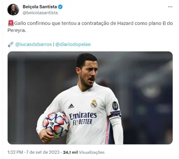 Conhecido mundialmente por boas atuações na Seleção da Bélgica, além de brilhar por Lille e Chelsea, Eden Hazard decepcionou seus fãs quando chegou no Real Madrid, já que não teve boas atuações e praticamente foi esquecido no mundo do futebol. Há cerca de 1 mês, Alexandre Gallo, do Santos, confirmou que fez oferta para trazê-lo ao Brasil, mas ouviu um “não” dos representantes.