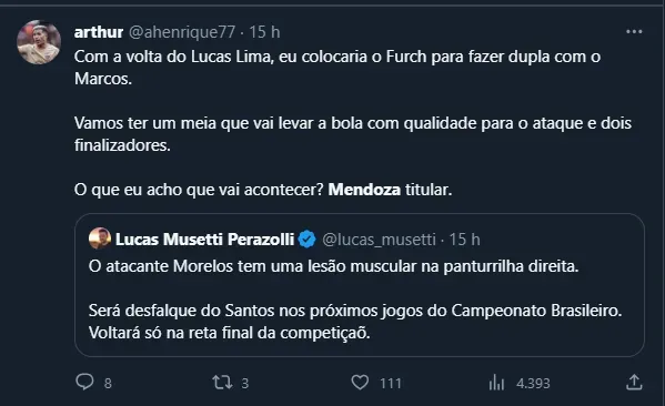 No clássico contra o Palmeiras, Morelos foi titular e formou uma boa dupla ao lado de Marcos Leonardo, criando altas expectativas na torcida. Entretanto, por conta de uma lesão muscular na panturrilha direita, o colombiano deve perder praticamente todo o restante da temporada, com a possibilidade de voltar na reta final do Brasileirão.