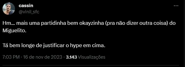 “Hum… Mais uma partidinha bem okayzinha (pra não dizer outra coisa) do Miguelito. Tá bem longe de justificar o hype em cima”, e “Não relou na bola também viu”, foram alguns dos comentários dos santistas.