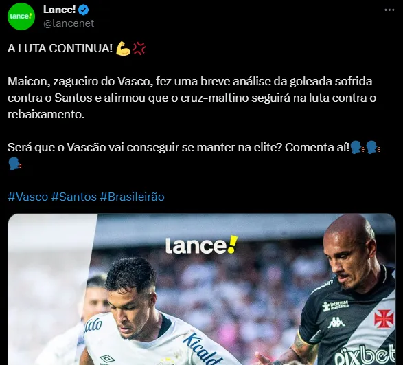 No Santos, o zagueiro chegou na temporada passada afirmando que realizava um sonho de vestir a camisa do time de coração do seu pai. Pelo Peixe, foram 42 partidas, sem marcar gols. Já no Vasco, Maicon é opção no banco de reservas e atuou em seis jogos. Agora, para a rodada ser ainda melhor, o Santos torce para o Botafogo vencer o Goiás, em duelo desta segunda, no Engenhão.
