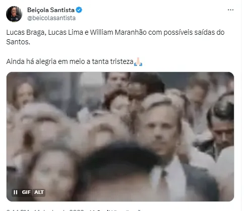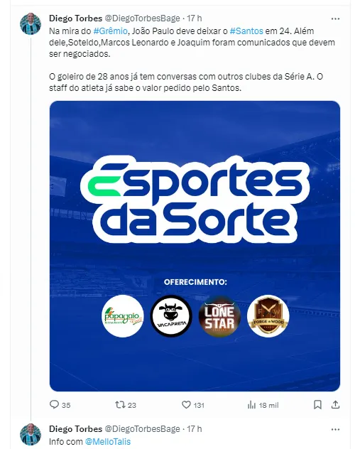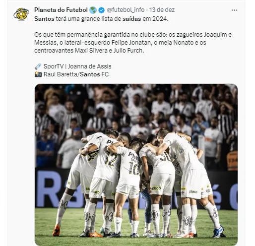“Na mira do Grêmio, João Paulo deve deixar o Santos em 24. Além dele, Soteldo, Marcos Leonardo e Joaquim foram comunicados que devem ser negociados”, informou o colega através de publicação em suas redes sociais.