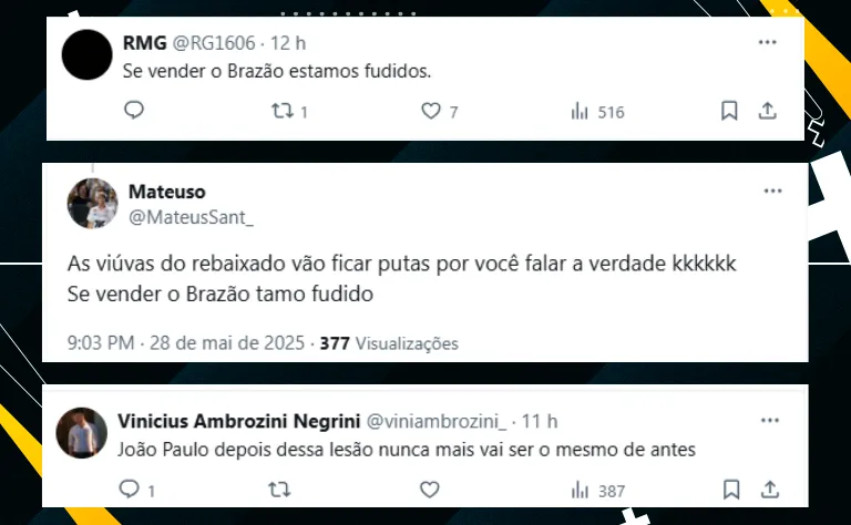 Aproveitando esse gancho, é bacana frisar que o camisa 10 foi questionado sobre a renovação de contrato e declarou que só pensará nisso após o dia 12. Seu vínculo atual termina no final de junho. Veja os comentários sobre João Paulo: