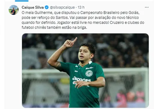 “O meia Guilherme, que disputou o Campeonato Brasileiro pelo Goiás, pode ser reforço do Santos. Vai passar por avaliação do novo técnico quando for definido. Jogador está livre no mercado! Cruzeiro e clubes do futebol chinês também estão na briga”, relatou Caique Silva.