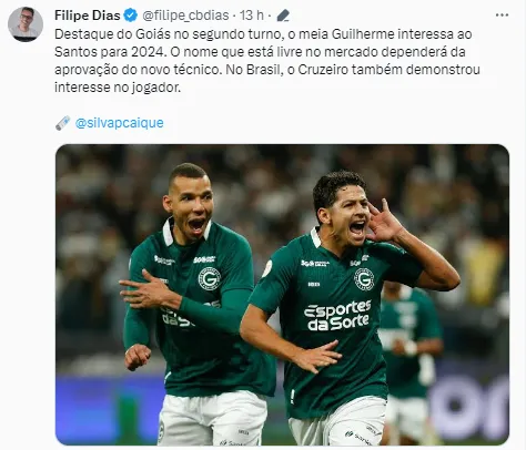 “Destaque do Goiás no segundo turno, o meia Guilherme interessa ao Santos para 2024. O nome que está livre no mercado dependerá da aprovação do novo técnico. No Brasil, o Cruzeiro também demonstrou interesse no jogador”, publicou Filipe Dias.