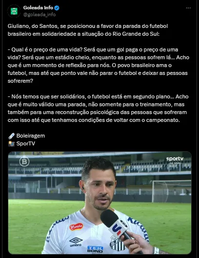Giuliano, que já jogou no Grêmio e Inter, e hoje está no Peixe, desabafou sobre uma pausa no futebol brasileiro pela tragédia que está atingindo o Rio Grande do Sul. “Qual é o preço de uma vida? Será que um gol paga o preço de uma vida? Será que um estádio cheio, enquanto as pessoas sofrem lá… Acho que é um momento de reflexão para nós”, começou.