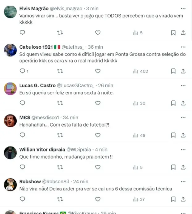 “Um gol achado no final do jogo, fruto do desespero, daria o empate e uma sobrevida para a comissão técnica. A derrota é o melhor resultado diante do futebol apresentado. Depois de hoje, tem que mandar todo mundo embora, até o preparador de goleiros!“, escreveu outro torcedor