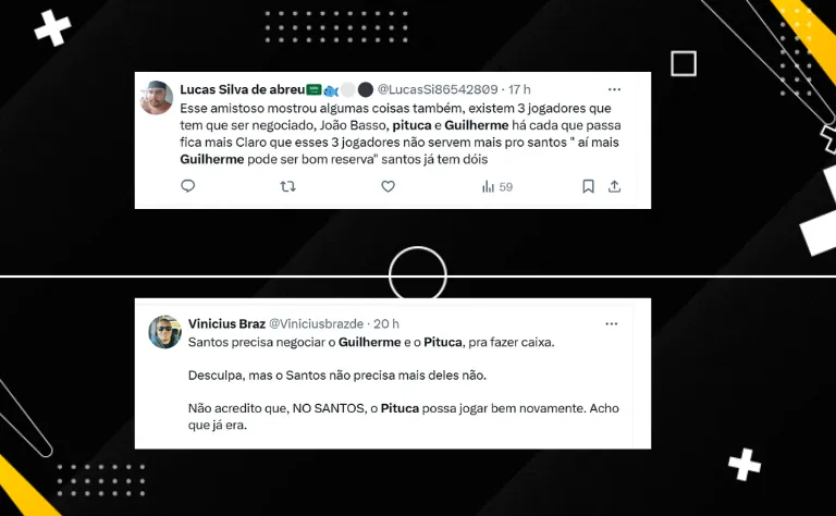 “Santos precisa negociar o Guilherme e o Pituca para fazer caixa. Desculpa, mas o SFC não precisa mais deles. Não acredito que, no Santos, o Pituca possa jogar bem novamente. Acho que já era”, disse um torcedor na noite de ontem.