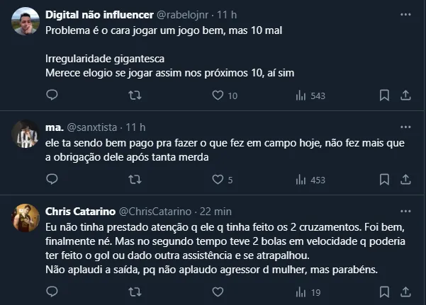Este último citado, inclusive, foi o autor do segundo gol santista na partida e tem sido um dos principais nomes da equipe de Fábio Carille. Além do papel exercido dentro das quatro linhas, ele também vem sendo um verdadeiro líder do elenco.