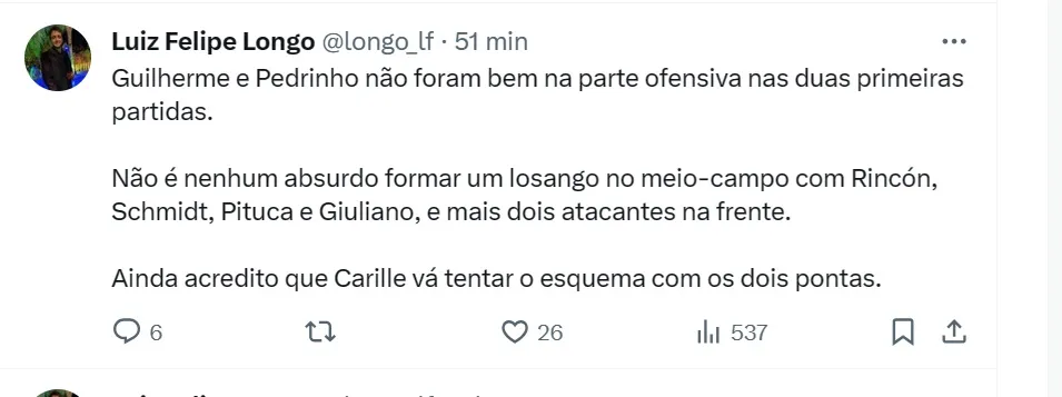Como apurou a nossa reportagem, a princípio, Guilherme será ‘sacado’ para a entrada de Rincón no meio de campo. Com isso, Pedrinho fica na frente com Julio Furch. Alfredo Morelos está sendo preparado para estar à disposição na 4ª rodada do Campeonato Paulista.