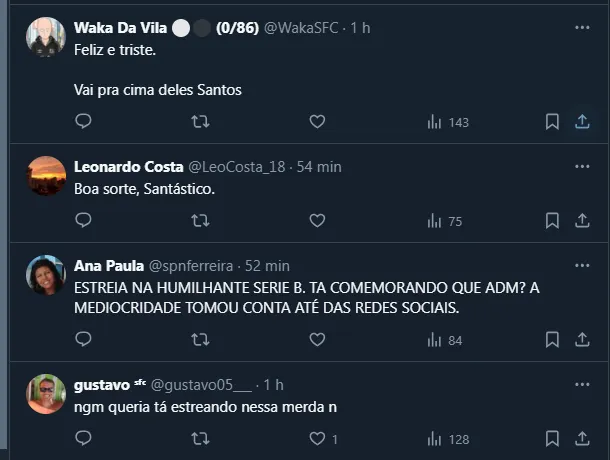 Ele ainda prosseguiu: “O Santos é o Santos. Tenho certeza que os jogadores do Santos também pensarão ponto a ponto, na regularidade para alcançar 45 pontos o mais rápido possível e depois no acesso. Assim é a vida na Série B“, finalizou.