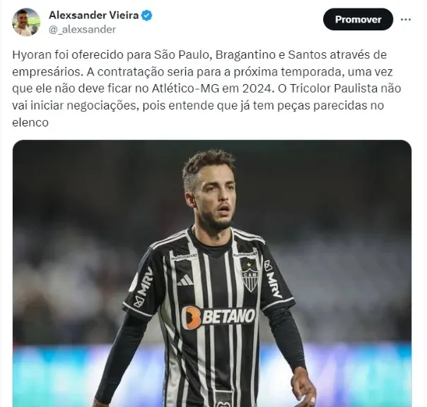 A contratação seria para a próxima temporada, uma vez que ele não deve ficar no Atlético-MG em 2024. O Tricolor Paulista não vai iniciar negociações, pois entende que já tem peças parecidas no elenco.