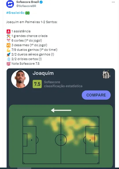 No clássico contra o Palmeiras, Joaquim também acabou sendo decisivo. Novamente, o zagueiro desviou de cabeça para Tomás Rincón marcar o gol de empate ainda no primeiro tempo. Além disso, foi implacável defensivamente. De acordo com o Sofascore, além da assistência e de ter uma grande chance criada, ele teve seis cortes, três desarmes, 7/9 duelos ganhos, 2/2 duelos aéreos ganhos e 2/2 dribles certos.