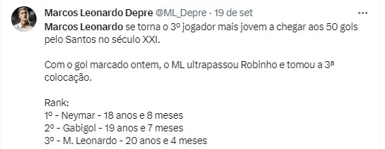 Falando no elenco santista, um jogador do Leão do Mar acabou recebendo uma notícia nos bastidores ingrata, mas que agradou a cúpula santista. O treinador Ramon Menezes acabou não convocando Marcos Leonardo para a disputa do Pan-Americano, pela Seleção Brasileira, que ocorrerá em Santiago, no Chile, entre os dias 20 de outubro e 5 de novembro. O Brasil está em um grupo que enfrentará os Estados Unidos, Colômbia e Honduras.