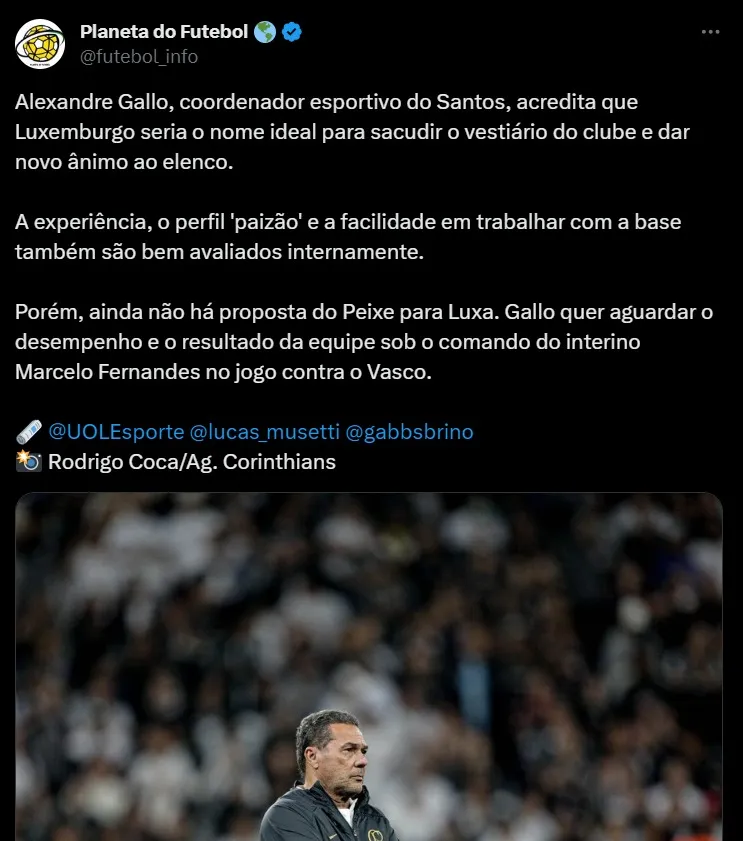 “Só podem estar brincando com a possibilidade de trazer Vanderlei Luxemburgo para comandar o Santos. Vanderlei já foi o melhor técnico do futebol brasileiro e um dos melhores do mundo durante um bom período, só que isso acabou. É impossível o Santos está cogitando a possibilidade, se a equipe não vencer o Vasco no final de semana, em trazer o Luxemburgo. Eu só posso encarar isso como uma grande brincadeira. Eu tenho certeza, que Alexandre Tadeu Gallo conhece de futebol, o Gallo foi jogador e foi treinador. O Gallo, inclusive, trabalhou na seleção brasileira, assim como o Luxemburgo. Mas o Gallo conhece de futebol, ele não viu o que o Corinthians não estava jogando? Será que no Santos as pessoas acham que a demissão do Vanderlei Luxemburgo do Corinthians foi equivocada? Pelo amor de Deus”, destacou.